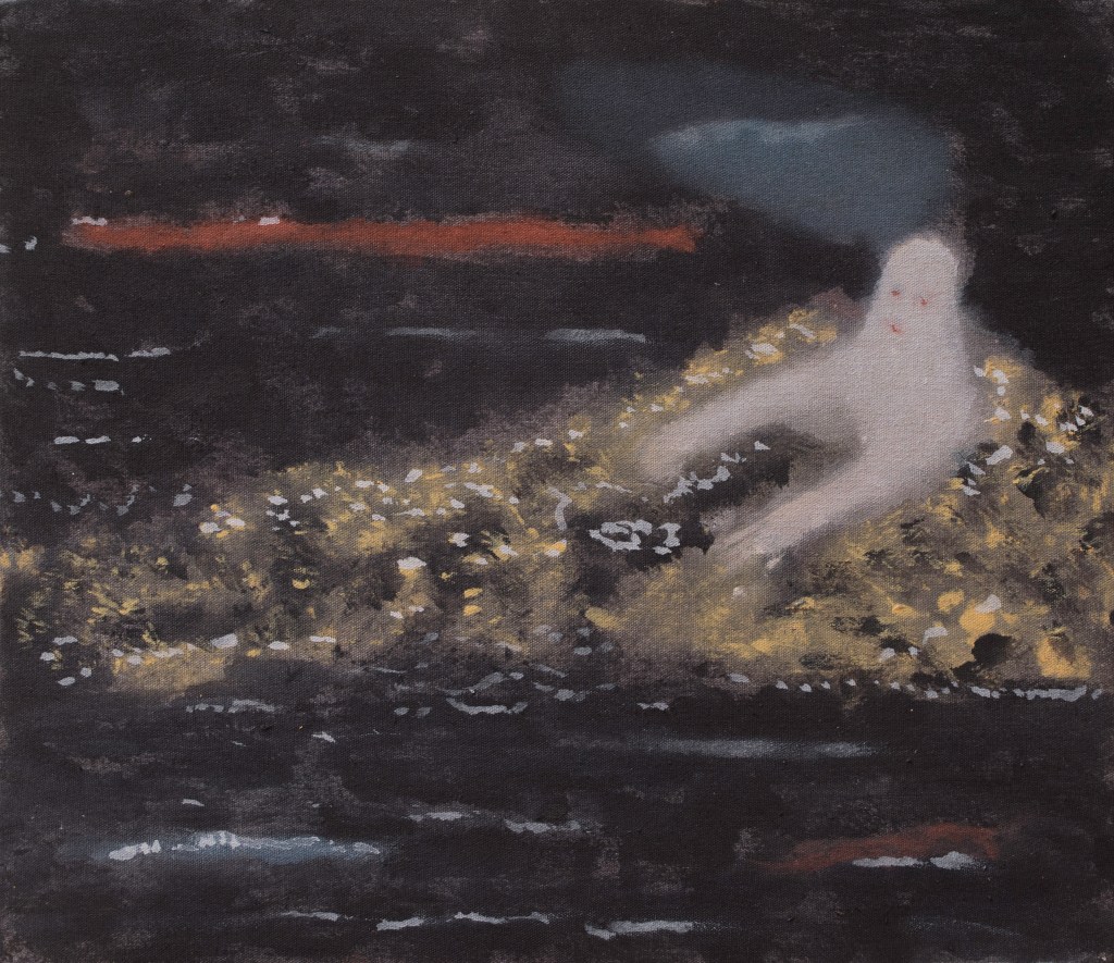 Figura en un río (nocturno), (2020). Acrylic on canvas. 33 × 28.5 cm