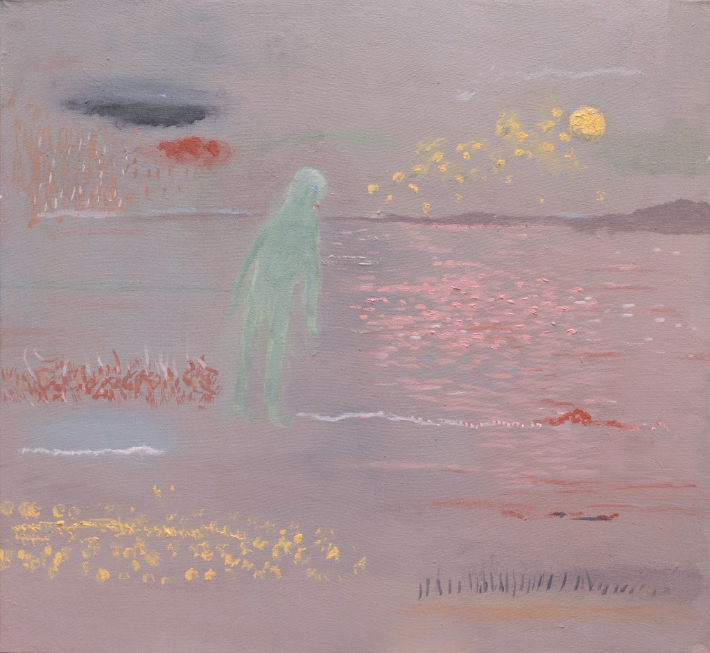 Figura a la orilla de un mar con luna amarilla, (2020). Acrylic on canvas. 48 × 52 cm.