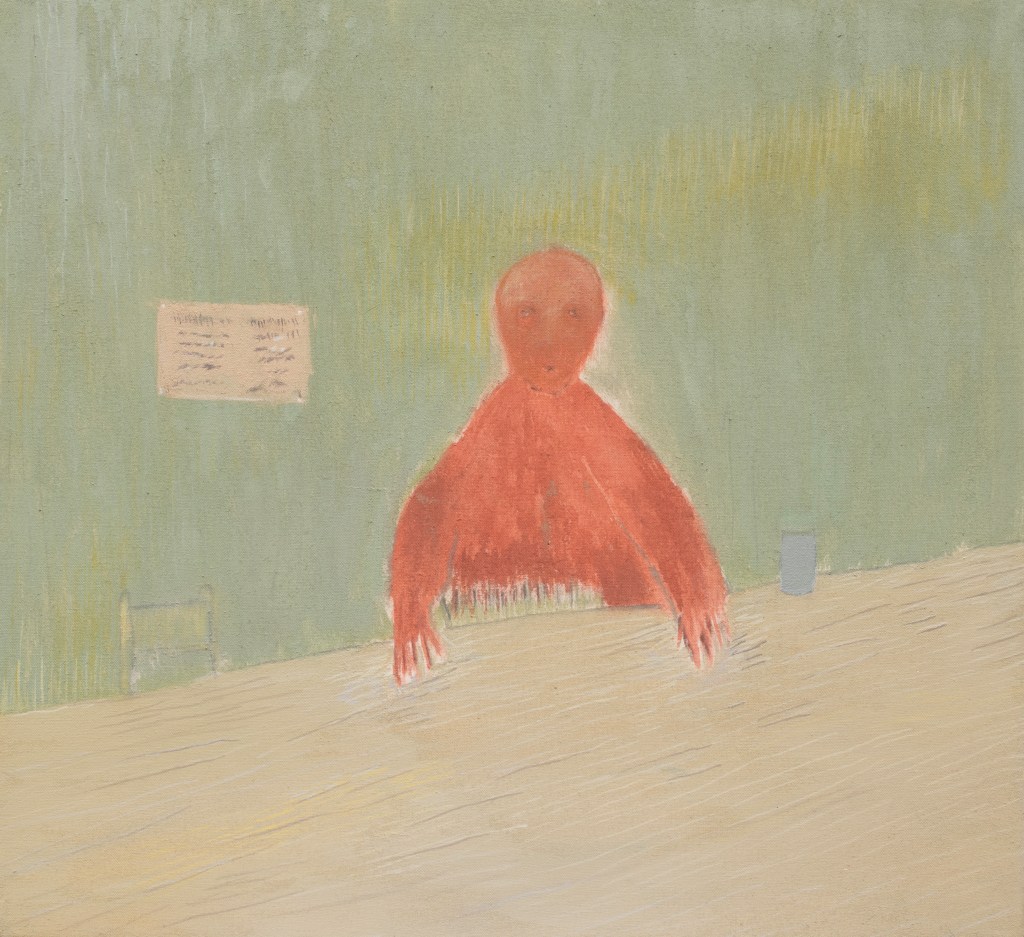 Figura en una mesa mirando al espectador, (2020). Acrylic on canvas. 48 × 52 cm.
