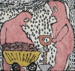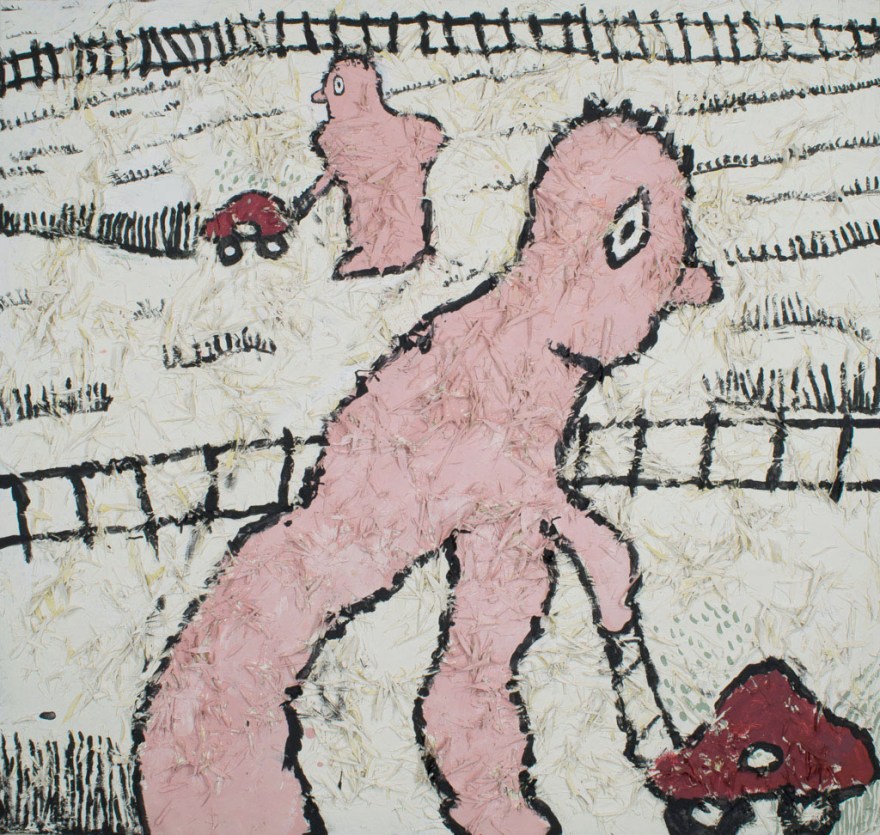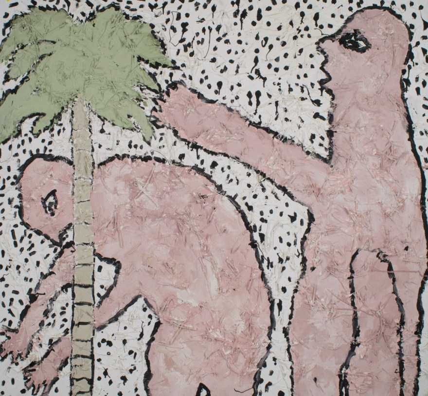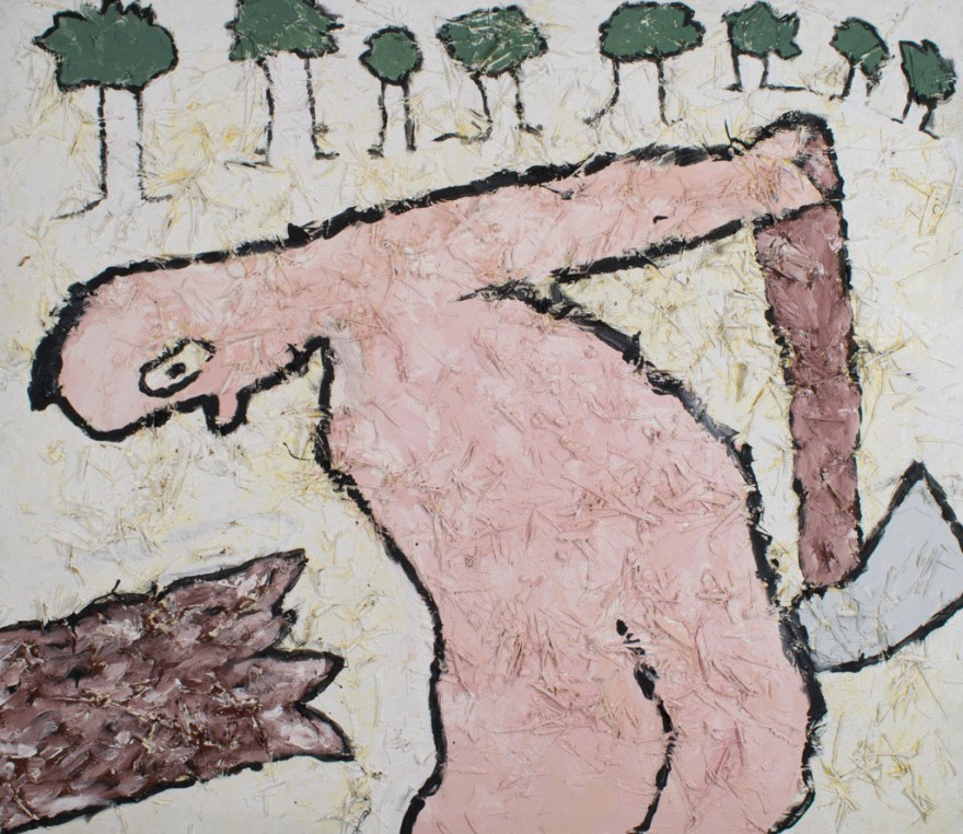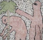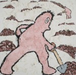 Leñador en el jardín, (2014). Mix media (acrylic and bamboo leaves) on synthetic fiber. 119.5 × 139 cm.